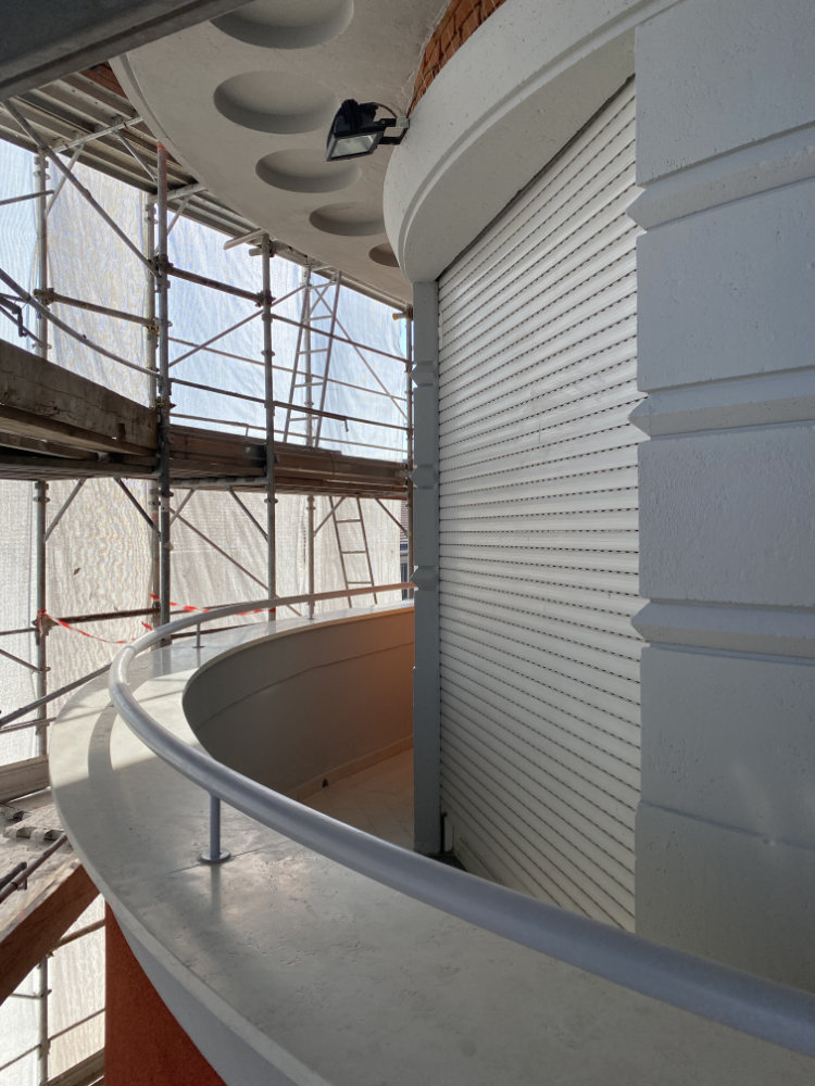 I balconi e i terrazzi sono stati impermeabilizzati con guaina liquida e adeguati alle normative con nuovi parapetti e finiture in marmo Perlino bianco.